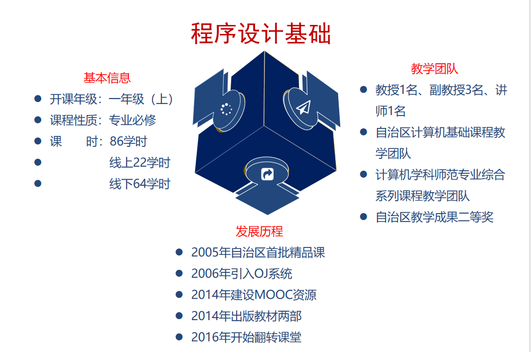 该课程具有扎实的学科基础,发展分为三个阶段:一是自二十世纪90年代开始的传统程序设计阶段;二是2005年实施的信息技术融合阶段;三是2016年开始的混合式教学阶段。课程重点解决三个关键问题: