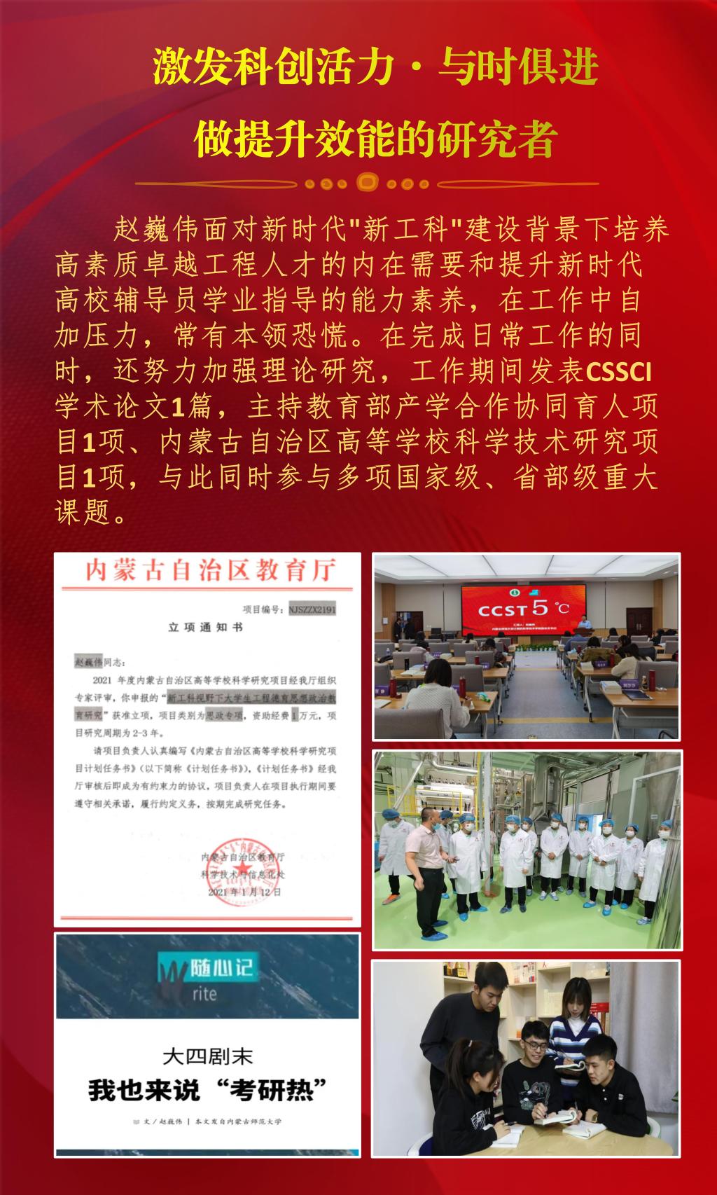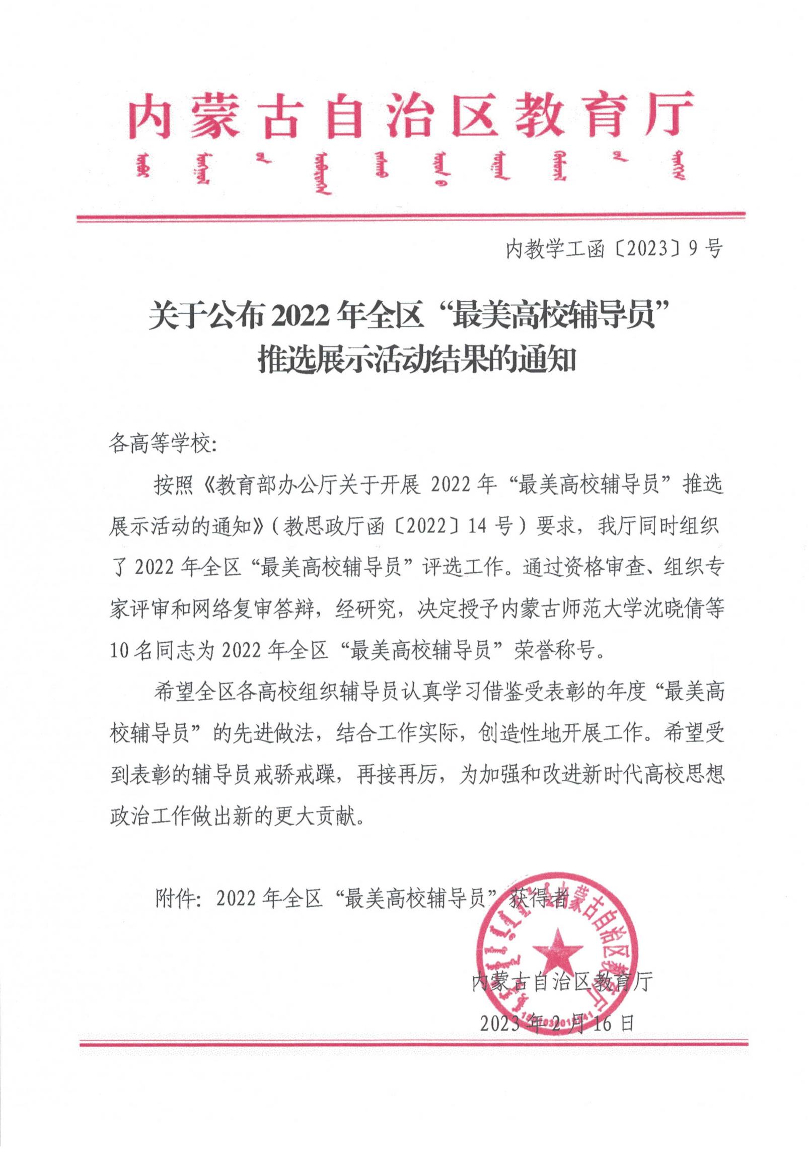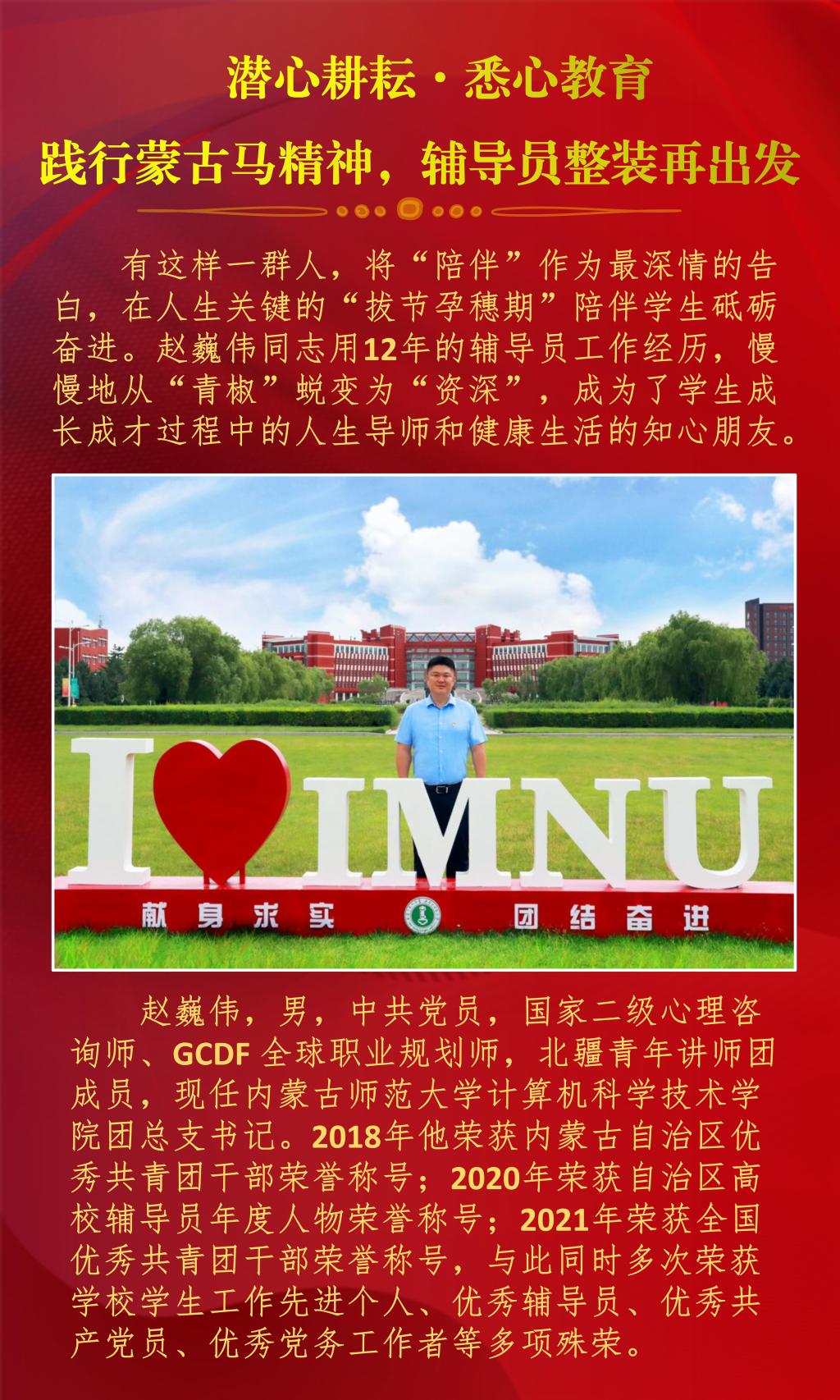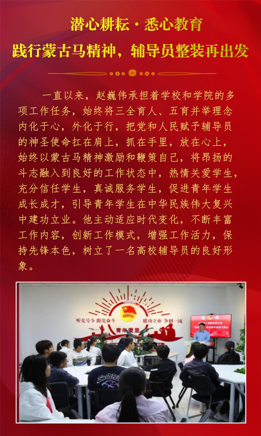 近日,内蒙古自治区教育厅公布了2022年全区最美高校辅导员推选展示活动的结果,经过资格审查、组织专家评审和网络复审答辩,授予10名辅导员“2022年全区最美高校辅导员荣誉称号”。Best365官网辅导员赵巍伟获此项荣誉。