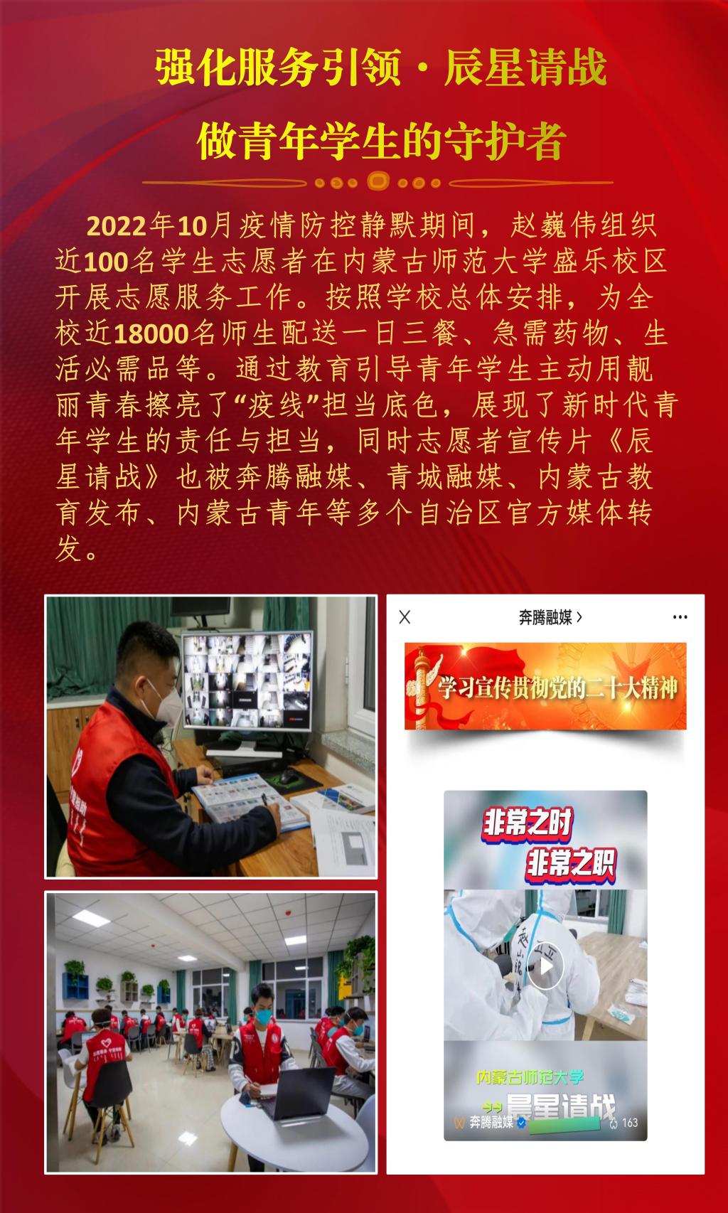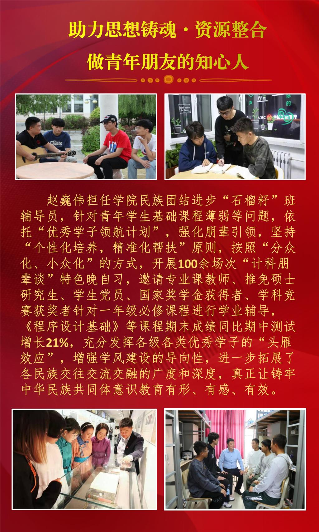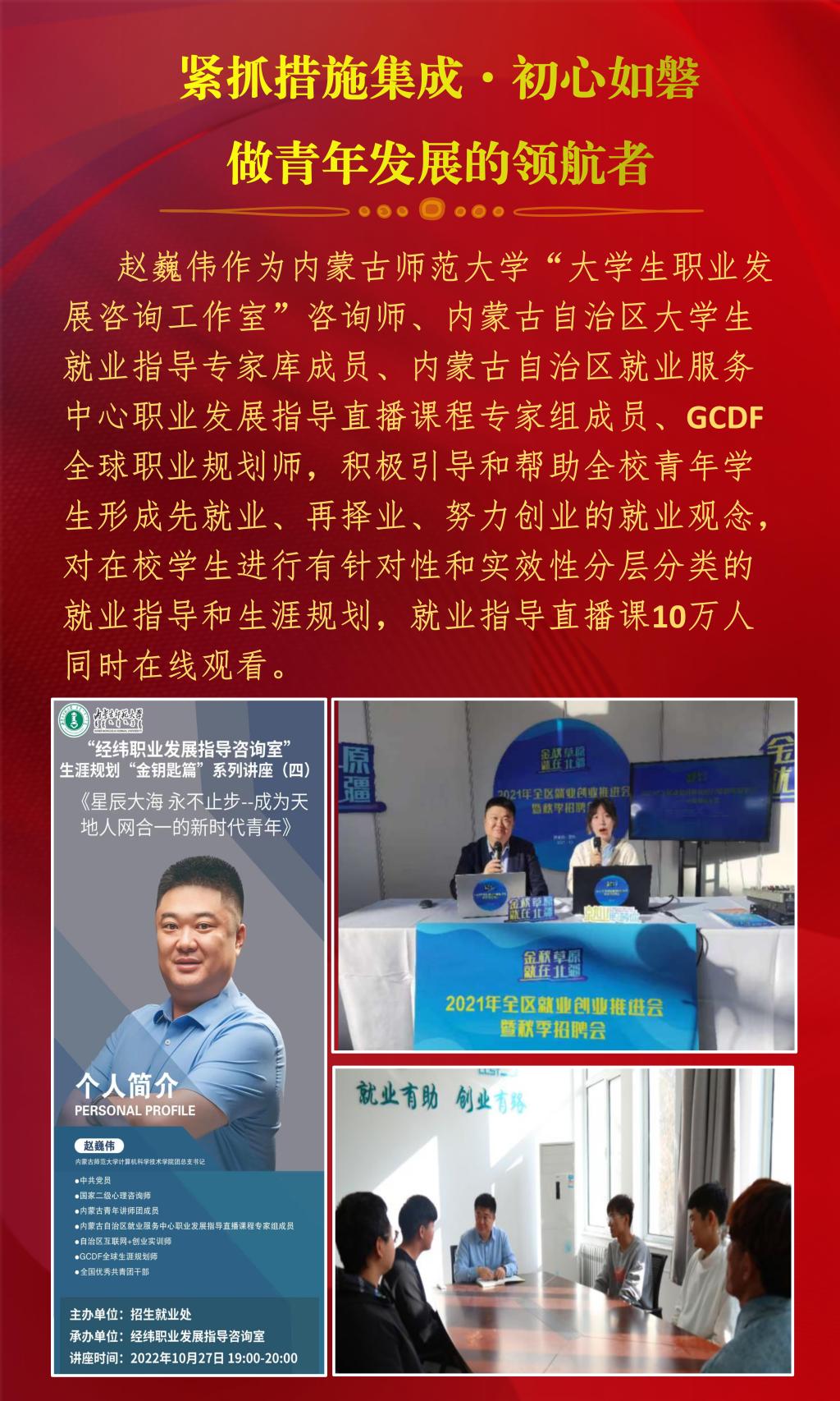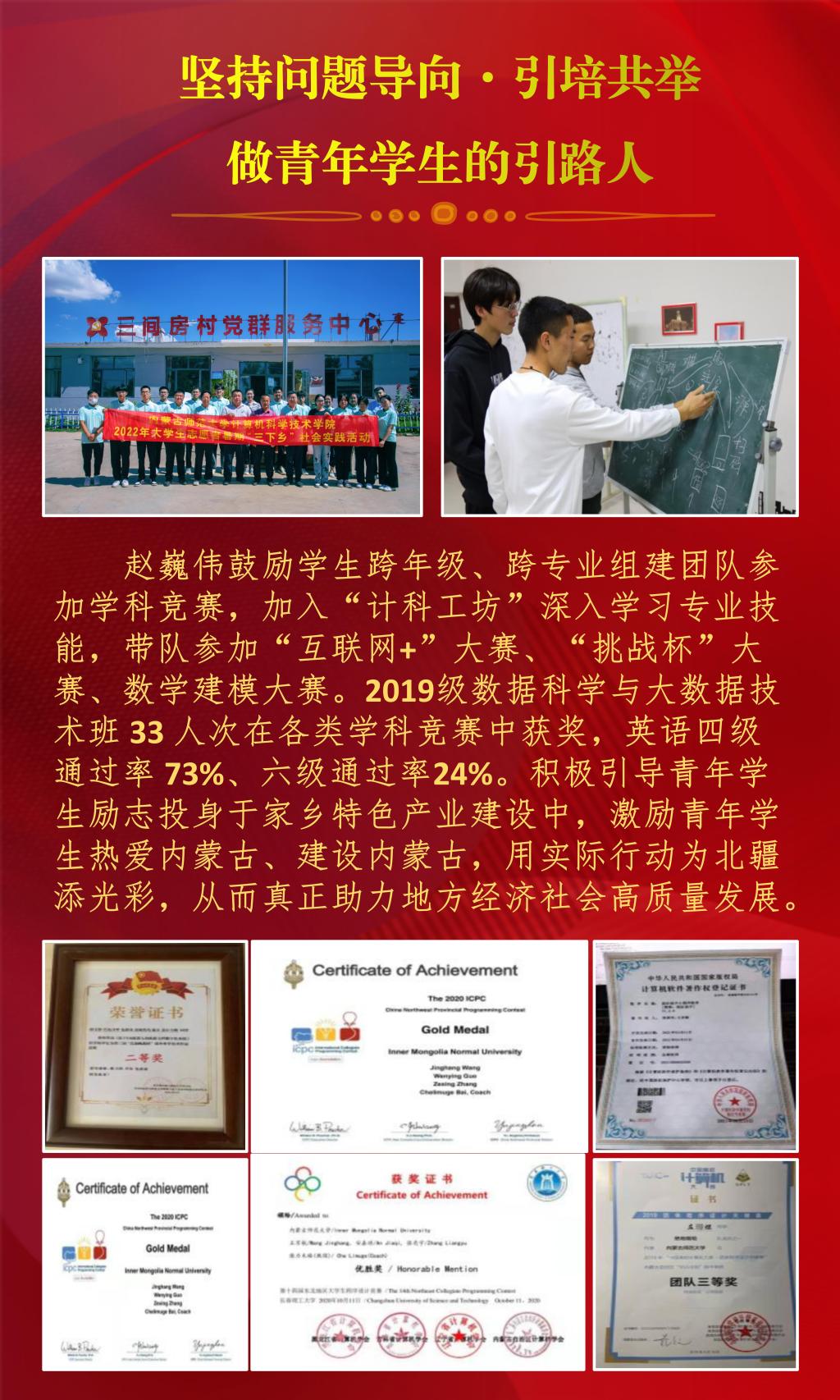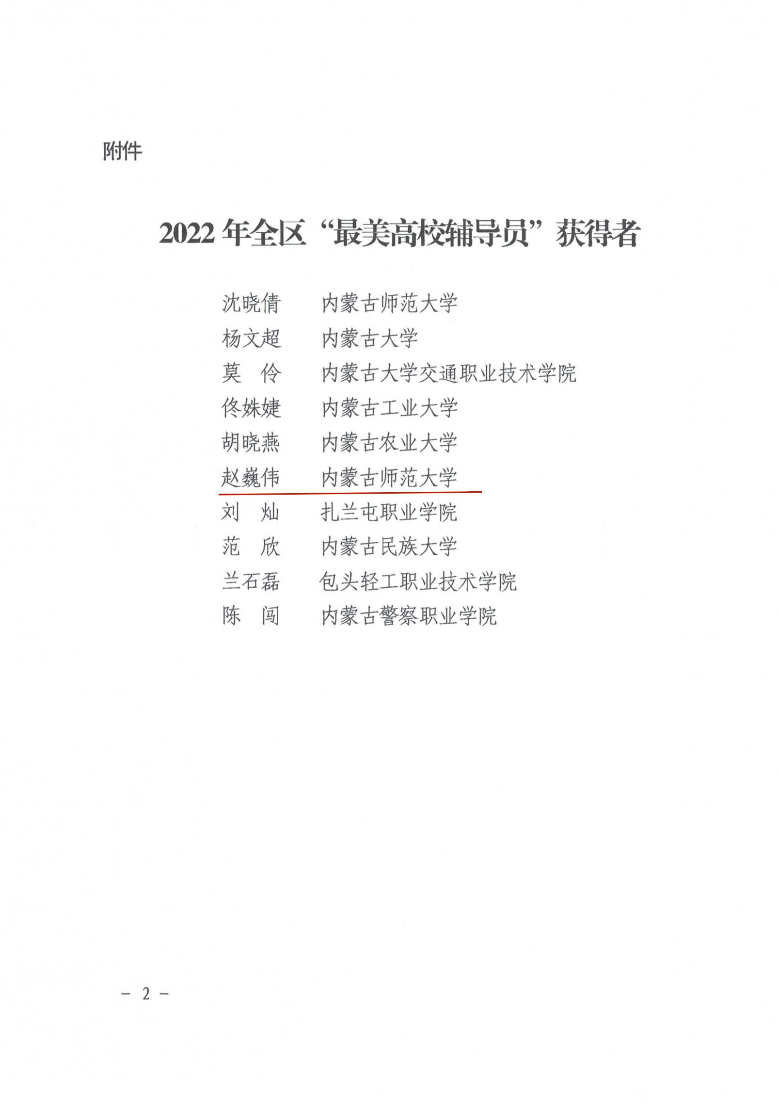 近日,内蒙古自治区教育厅公布了2022年全区最美高校辅导员推选展示活动的结果,经过资格审查、组织专家评审和网络复审答辩,授予10名辅导员“2022年全区最美高校辅导员荣誉称号”。Best365官网辅导员赵巍伟获此项荣誉。