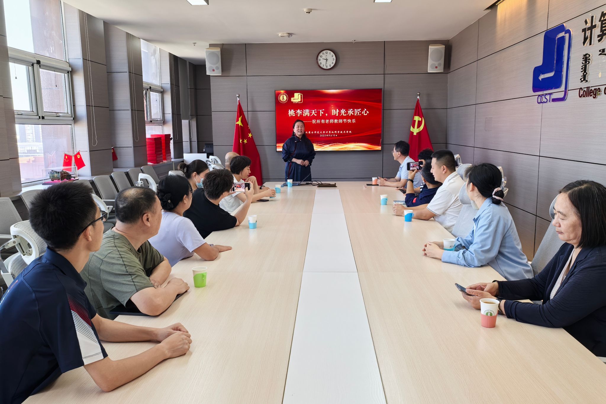 座谈会现场气氛热烈温馨。学院党委书记乌日其木格代表领导班子向辛勤工作在教学、科研和管理服务一线的全体教职工致以节日的祝贺和诚挚的问候。乌书记充分肯定了过去一学年学院在学科建设、人才培养、科学研究和社会服务等方面取得的成就,感谢全体教师为学院发展付出的努力。她希望全体教职工不忘初心使命,不断提升育人水平,争做"四有"好老师,当好学生成长的引路人,为培养更多计算机领域的优秀人才,服务国家和自治区发展作出更大贡献。