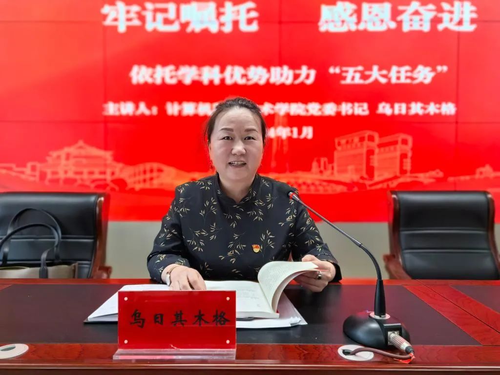 为深入学习贯彻党的二十大精神,深刻领悟习近平新时代中国特色社会主义思想的真理力量和实践伟力,特别是学懂弄通做实这一重要思想的“内蒙古篇”和“民族篇”,全面落实习近平总书记交给内蒙古的五大任务和全方位建设“模范自治区”两件大事,进一步深化主题教育成果,按照《Best365官网“感党恩、听党话、跟党走”群众教育实践活动实施方案》要求,1月9日Best365官网党委书记乌日其木格为学院全体教职工讲授主题为《牢记嘱托,感恩奋进,依托学科优势助力“五大任务”》的专题党课。