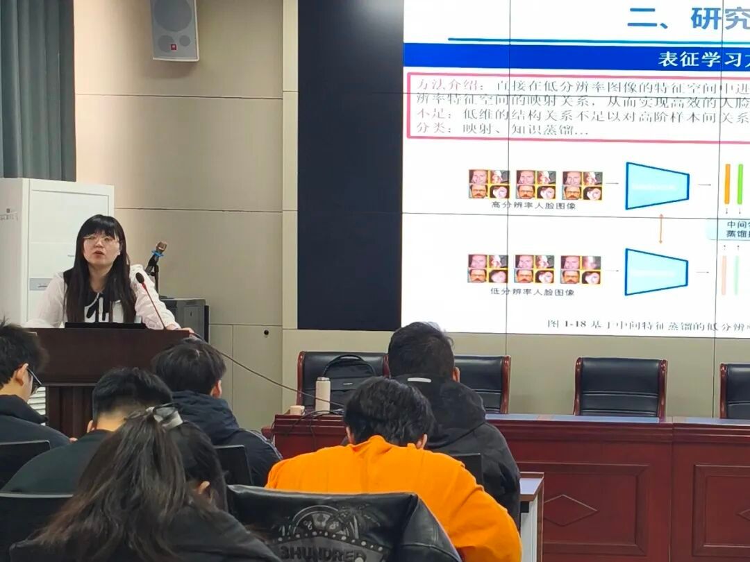 报告中,石老师以《低质量视觉物体理解》为具体案例,系统阐述了学术论文从选题、综述到研究设计、实验验证的全过程方法与逻辑脉络。他首先从视频监控、自动驾驶等实际场景中“看不清”“认不准”的痛点切入,说明如何将现实问题转化为具有理论价值与研究潜力的学术方向;在研究现状梳理部分,石老师强调应全面把握领域动态,并对超分辨率、低分辨率识别等关键技术分支进行了清晰分类与述评,引导听众学习如何识别研究缺口、确立创新点;在研究内容设计环节,他逐步呈现了“生成模型补细节—判别模型提特征—融合优化强性能”的递进式技术路线,展现了构建“问题—方案—验证”完整逻辑链条的思维过程;在实验论证部分,通过多数据集对比、消融分析等规范方法,生动说明了如何科学设计实验、扎实支撑论点。
