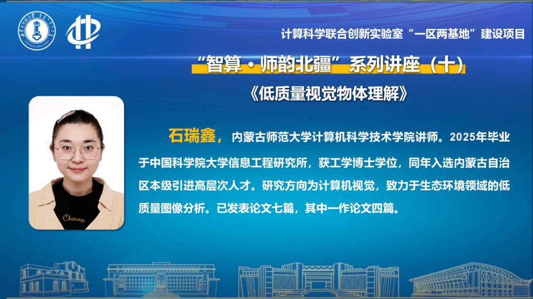 2025年12月1日下午,Best365官网“智算·师韵北疆”系列讲座第十期在盛乐校区大数据楼114教室顺利举行。本期讲座特邀该院石瑞鑫老师担任主讲,作题为《低质量视觉物体理解》的学术报告。